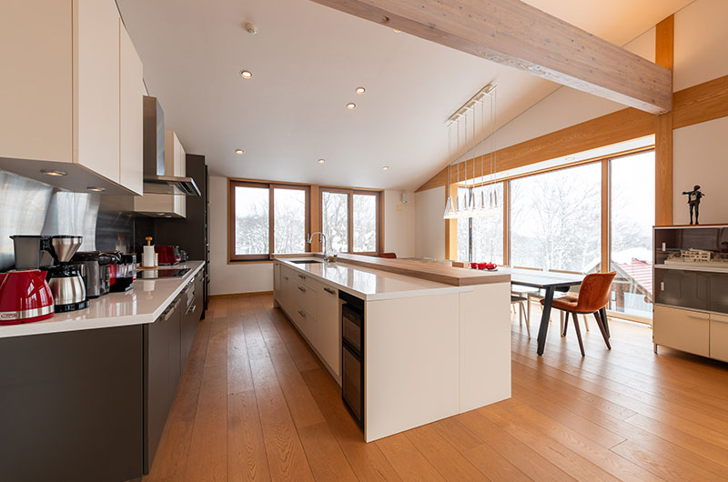 Kazane’s living room is easily one of the most scenic spaces in Niseko. Positioned on the top floor, the room is fronted by full wall glass and offers sweeping views of Mount Yotei. Allowing the views to take centre stage, the room is decorated with streamlined furniture rendered in light neutral tones. Fittings include a sleek white sofa and two chic armchairs which are angled towards a cosy woodburning fireplace that oozes mountainside ambiance. The living room extends to a generous balcony which gazes out to Mount Yotei.