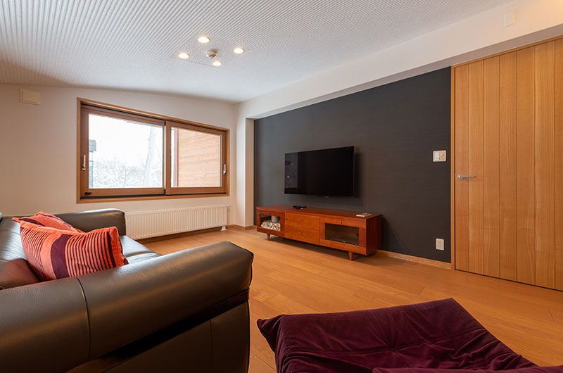 Tucked behind the living room, Kazane’s media room offers the perfect cosy setting for hosting movie nights after a day of skiing. The room features ample seating and a well-sized TV for bingeing on your favourite movies and TV shows. The room is adjoined by a small terrace.