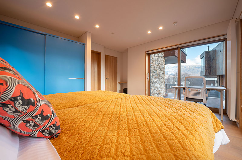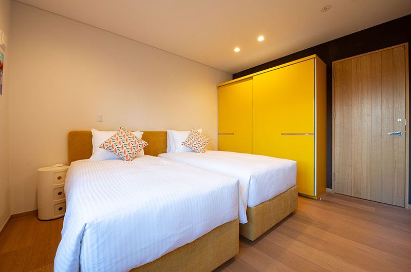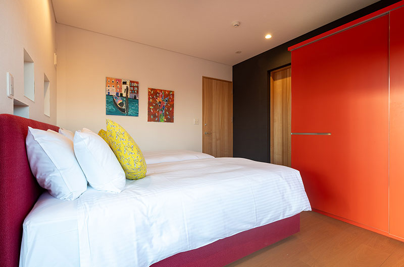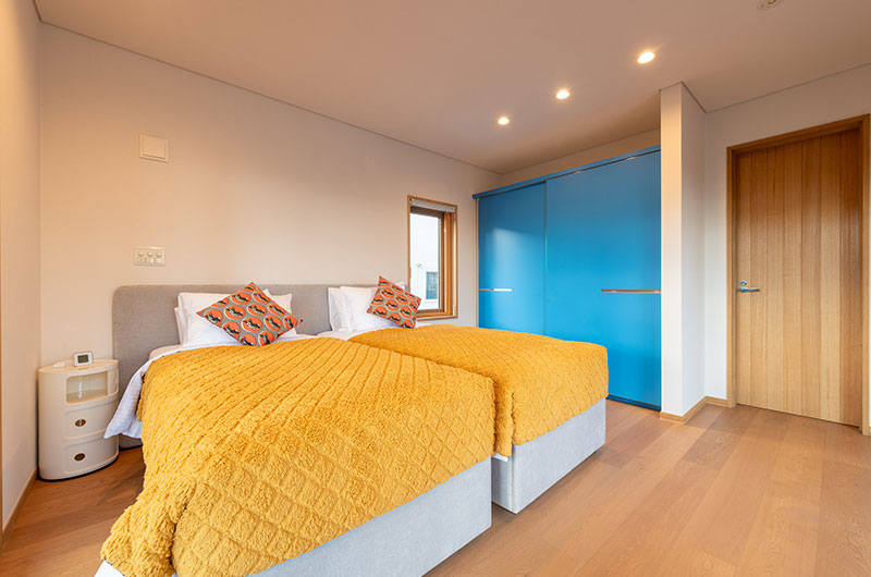 Kazane features six bedrooms. The bedrooms are rendered in white and light timber, with vibrant pops of primary colours adding some whimsy. The bedrooms are spread over three floors, so everyone gets to have their own space when needed. Bedding arrangements are very flexible: five rooms feature either a king or a queen bed, three of which can be converted into twin beds if needed. The sixth bedroom is a traditional tatami room which can sleep up to four guests on futon mattresses.