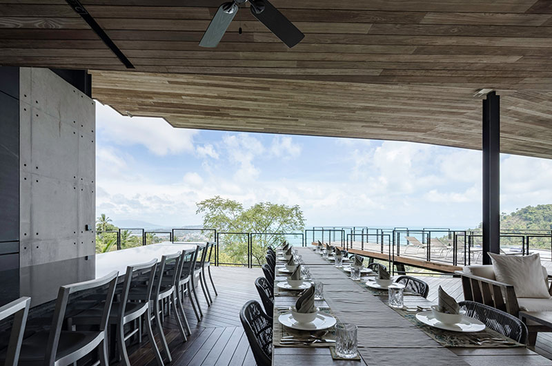 It’s hardly surprising that this stunner of a villa comes with two gorgeous dining areas. The first one is located in the living room where a stunning glass dining table sits surrounded by 10 elegant chairs. Alternatively, you can dine out on the poolside terrace where you’ll find a long dining table framed by the villa’s signature ocean views.
