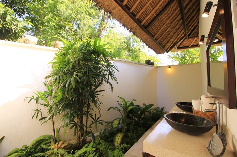 Set around the villa’s garden, the bathrooms are common for two rooms, offering a real sense of a family home. They benefit from double wash basins and a large shared mirror, offering plenty of space for him and her. The partially enclosed design of the roof ensures an airy feel and a real tropical experience is attained when using the the rain shower that is set amidst lush flowers and plants. One of the bathrooms comes equipped with a massage table, offering the opportunity to indulge in traditional Balinese massages without ever stepping foot outside the villa.