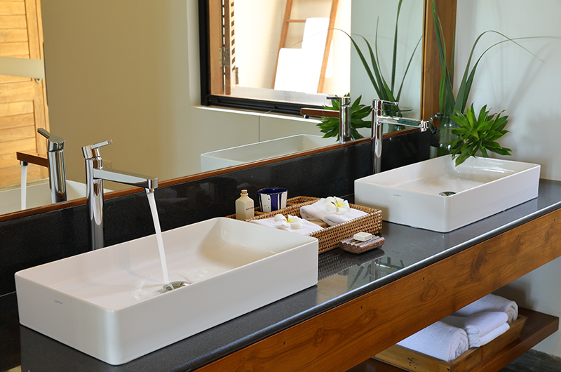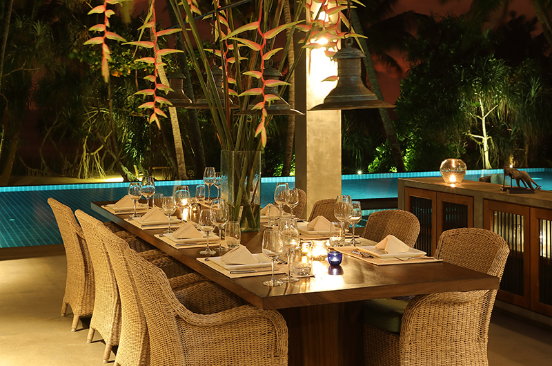 The dining area is a fluid extension of the open plan living room. Housed beneath a high vaulted ceiling and ample ceiling fans, this breezy setup invites guests to dine alfresco while also keeping nice and cool. The open plan layout allows you to truly appreciate the surrounding scenery and hey – nothing beats dining out by the ocean! For a more intimate setting, you can also enjoy your meals out by the pool – this setting is particularly enchanting during and after sunset. The kitchen is discretely tucked away from the living and dining areas, allowing the staff to prepare meals without having to interrupt private moments spent with friends and family.