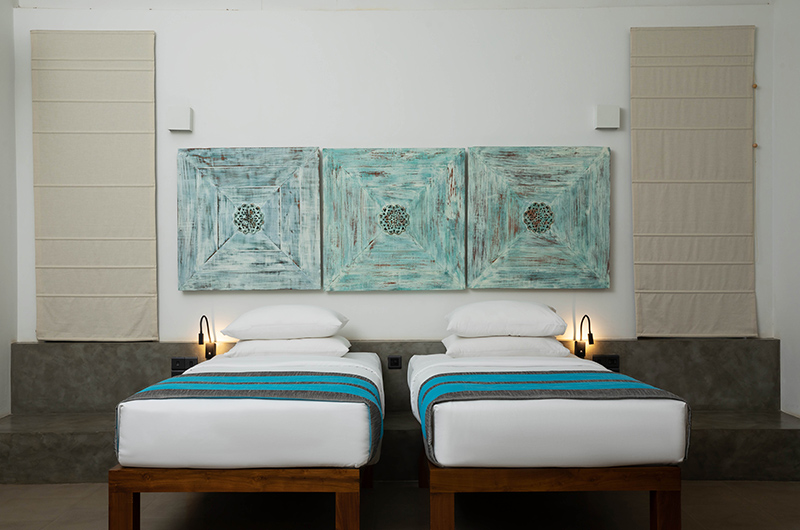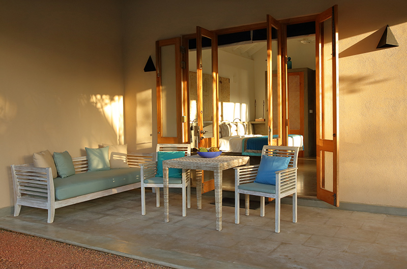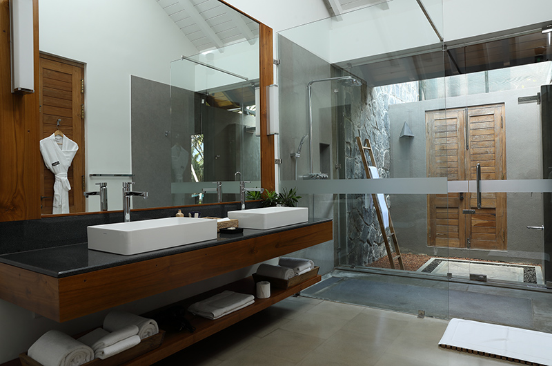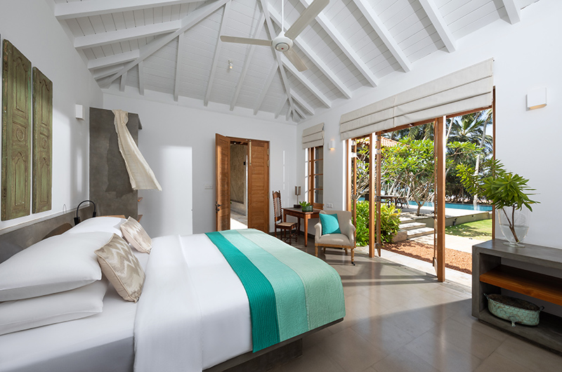 Villa Kirana features four bedrooms. The rooms are styled in calm tones of white, grey and beige, with vibrant shades of green, blue and turquoise echoing the colours of the pool, the ocean and the sunny blue skies of Sri Lanka. Each room features ample windows, storage space, an ensuite bathroom and a writing desk for those moments when you simply have to break out the laptop. Two of the rooms interconnect, creating a functional “family suite” or simply a convenient setup for guests wanting to stay close to each other. As each room still has its own entrance and a private bathroom, there is still plenty of privacy for those who crave it.