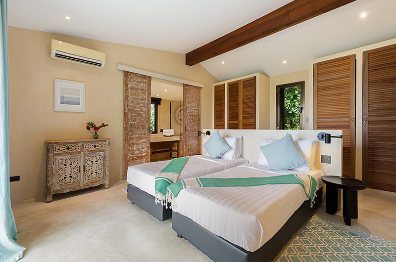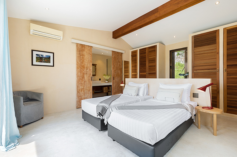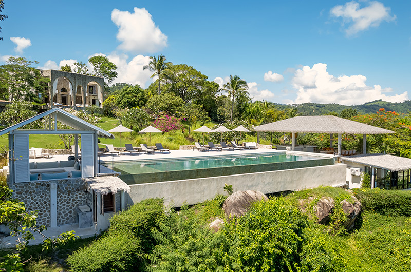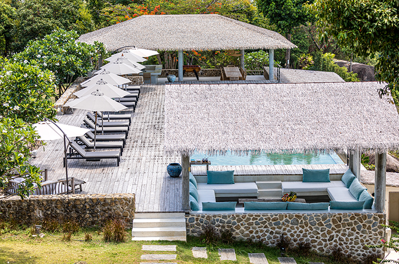 Koh Koon is a seven-bedroom villa (with two additional children’s rooms) that’s built into several pavilions. The main building houses the living and dining areas on the ground floor, with the master bedroom located on the upper floor. One of the kids’ bedrooms is located below this main pavilion. The remaining bedrooms are housed in four pavilions. There are two bedrooms in the Mountain Villa. Kika bedroom is housed in its own pavilion. The Sea View Villa houses two interconnecting bedrooms. The Alex Villa houses two more bedrooms, including a children’s room with four single beds. Koh Koon is set over generous gardens, with a large pool area furnished with sun loungers, a covered lounge and an alfresco dining area.