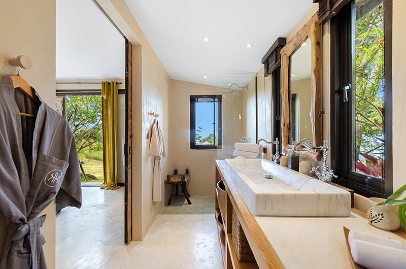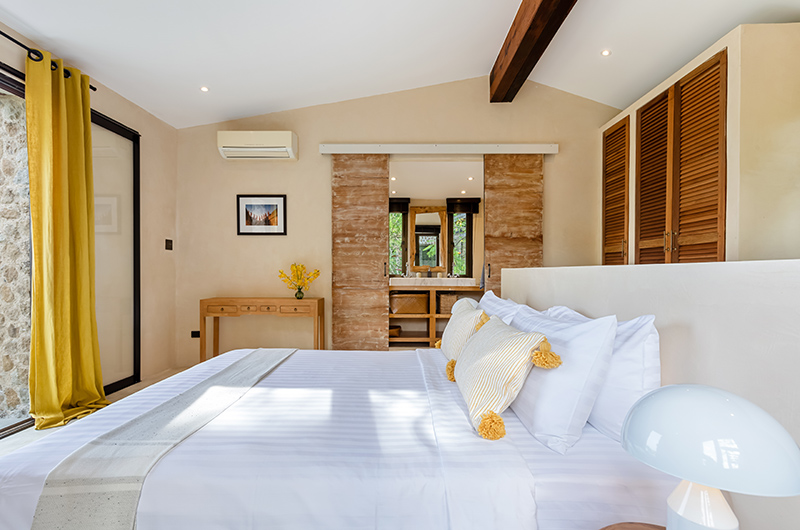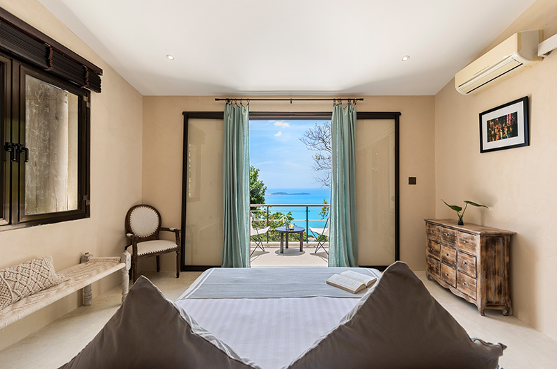 The “Alex” sea view bedroom has a queen-sized bed and an ensuite bathroom with a shower. This room is located above bedroom 8.