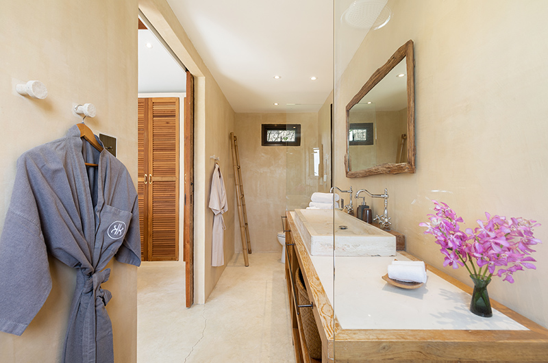 The master bedroom has a king-sized bed and a private balcony. The ensuite bathroom is furnished with double showers and dual sinks.