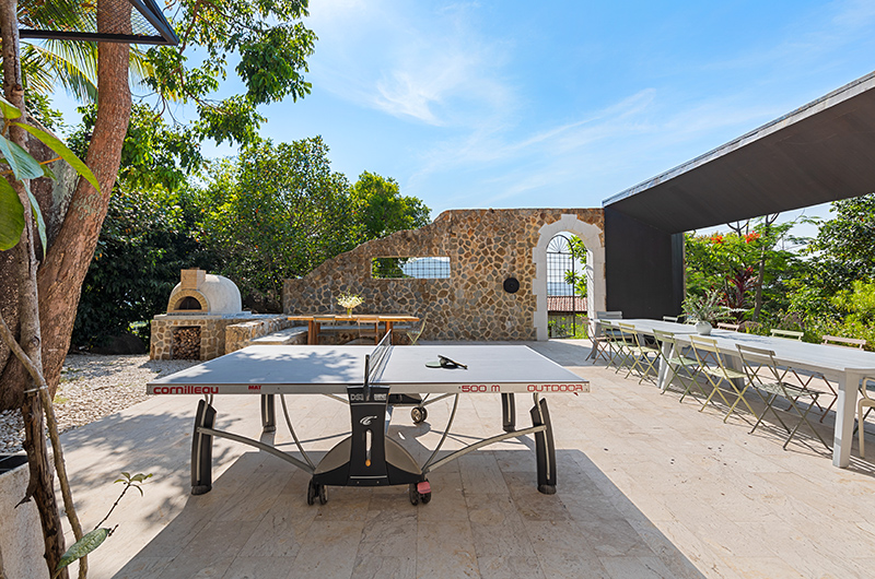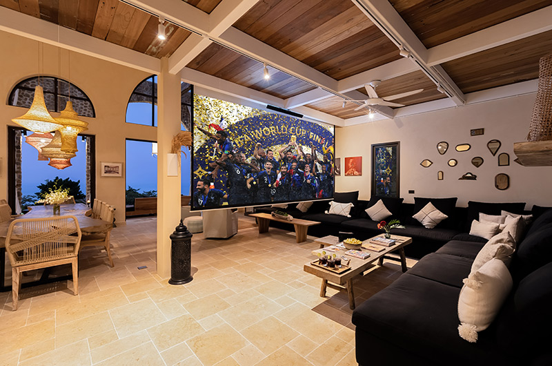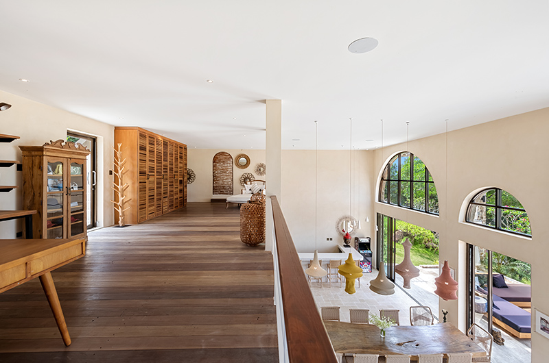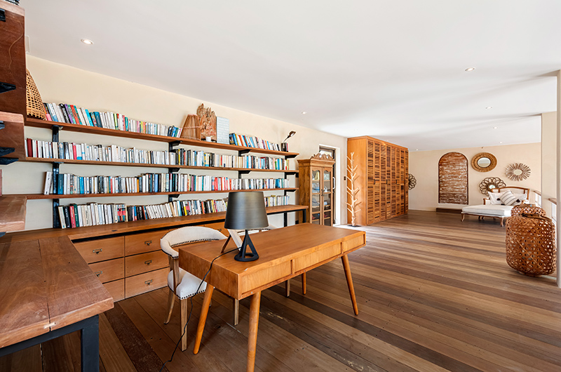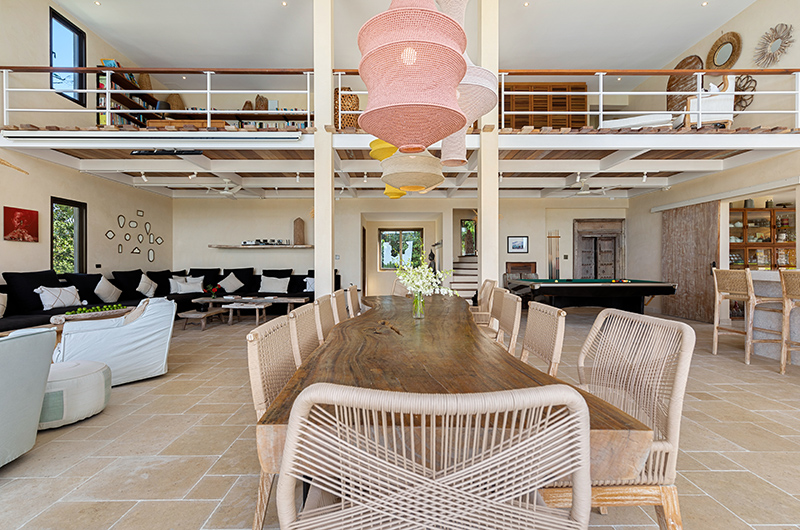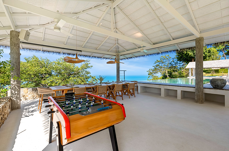 Located on the ground floor of the main house, Koh Koon’s living room has a soaring high ceiling, with glass doors overlooking the garden. The living room is furnished with ample sofas and arm chairs that are perfect for hosting a large group. The room also includes a bar area and pool table. The villa also includes a foosball table and darts. There is a study room on a mezzanine level above the living room.