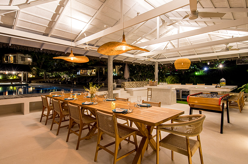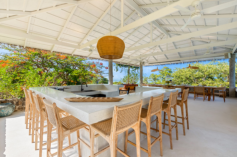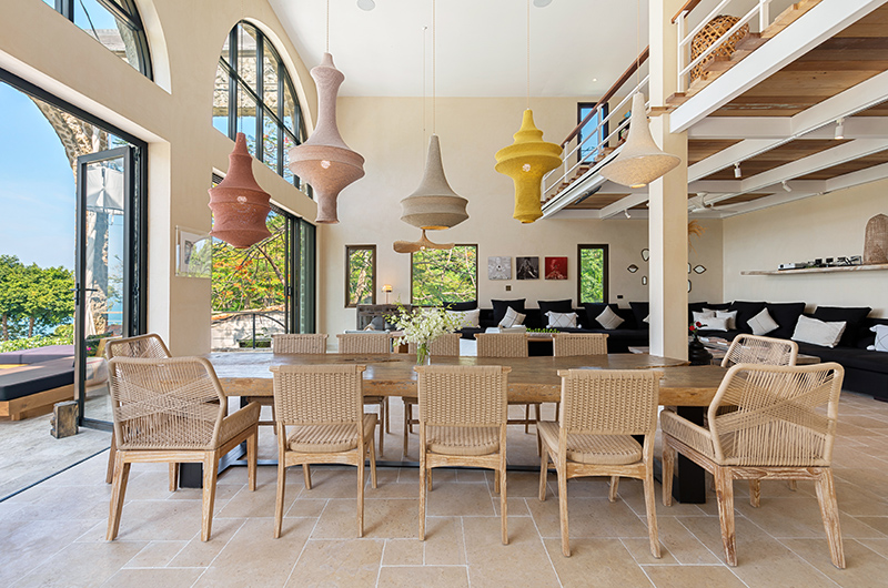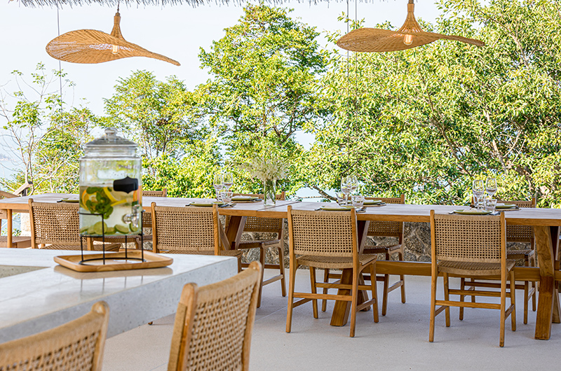 Koh Koon’s indoor dining table can accommodate up to 18 guests. The kitchen is equipped with sleek Smeg appliances. A second dining area is located in the poolside lounge and it’s adjoined by an outdoor bar and offers amazing ocean views.