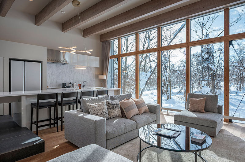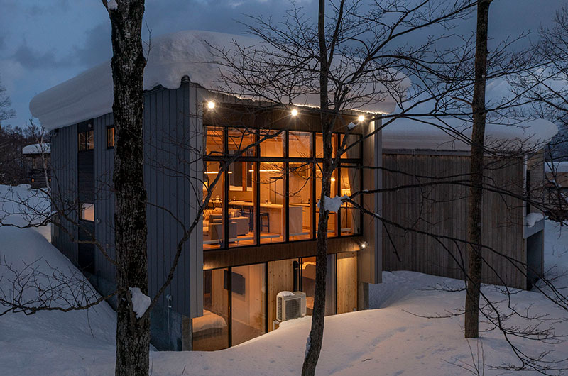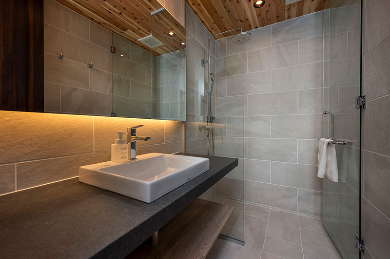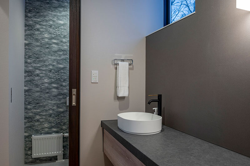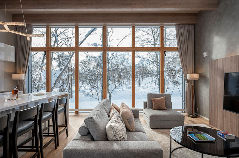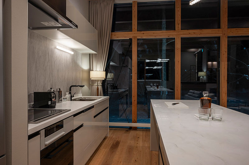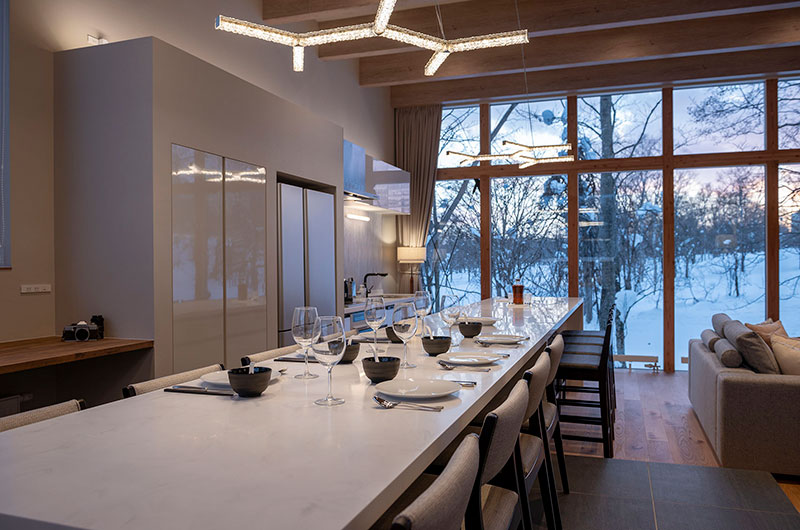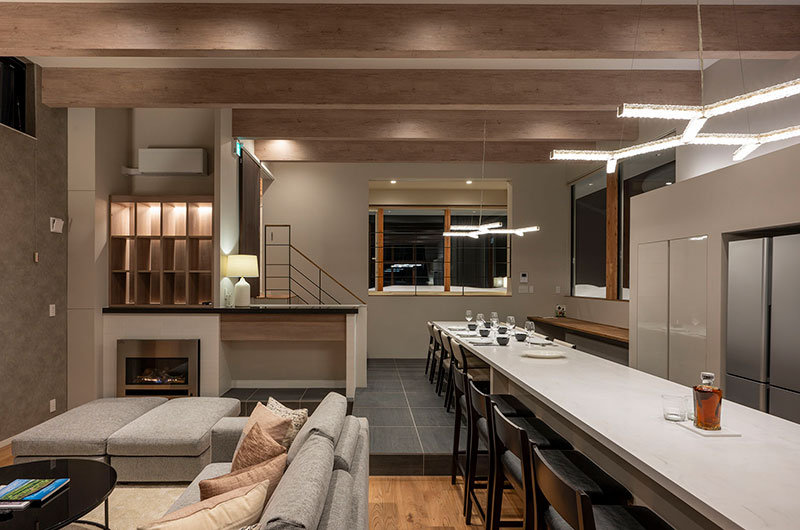 Kumirin offers a chic take on winter wonderland. This smart modern chalet is positioned in Niseko’s St. Moritz, surrounded by beautiful silver birch trees and neighboured by other equally elegant abodes. The chalet looks incredibly inviting from the outside, its full wall windows offering glimpses of the cosy setup waiting indoors. The upper floor features open plan living areas that include a genius kitchen setup: a huge white island that extends to a dining table, meaning there’s always room for a dinner party. The cosy fireplace and those beautiful snow-covered views make the space all the more winning. The bedding arrangements are another stroke of design genius. Of the three bedrooms, one has a king-sized bed (or two singles if you prefer), one has bunk beds, and the third has Japanese style futons. This versatility ensures that everyone will find a bedroom that’s just right.