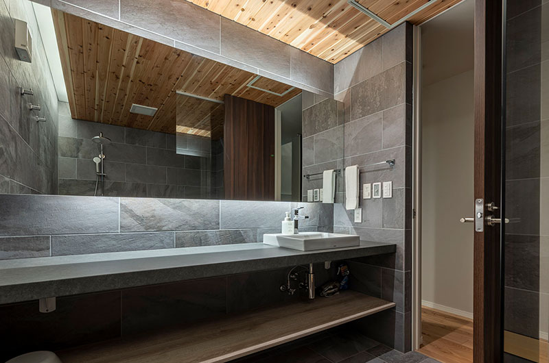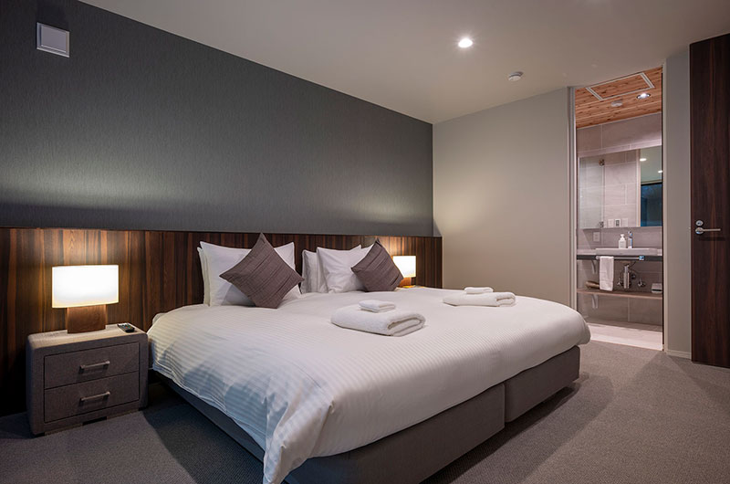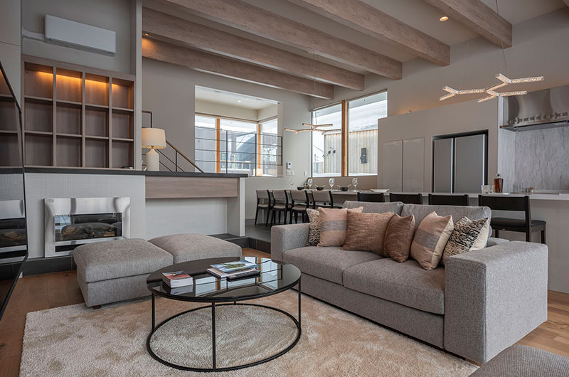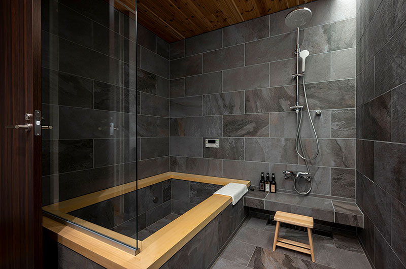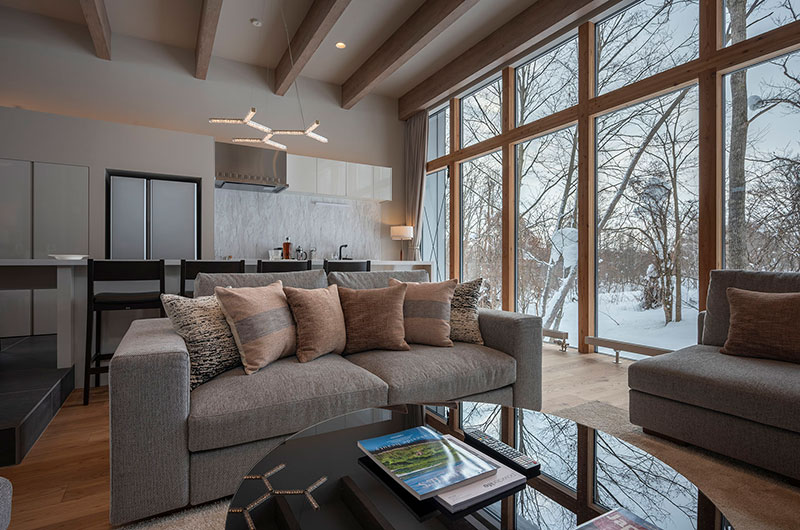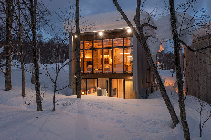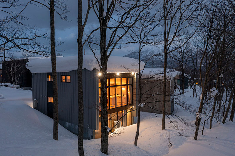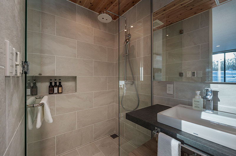 Kumirin offers a chic take on winter wonderland. This smart modern chalet is positioned in Niseko’s St. Moritz, surrounded by beautiful silver birch trees and neighboured by other equally elegant abodes. The chalet looks incredibly inviting from the outside, its full wall windows offering glimpses of the cosy setup waiting indoors. The upper floor features open plan living areas that include a genius kitchen setup: a huge white island that extends to a dining table, meaning there’s always room for a dinner party. The cosy fireplace and those beautiful snow-covered views make the space all the more winning. The bedding arrangements are another stroke of design genius. Of the three bedrooms, one has a king-sized bed (or two singles if you prefer), one has bunk beds, and the third has Japanese style futons. This versatility ensures that everyone will find a bedroom that’s just right.