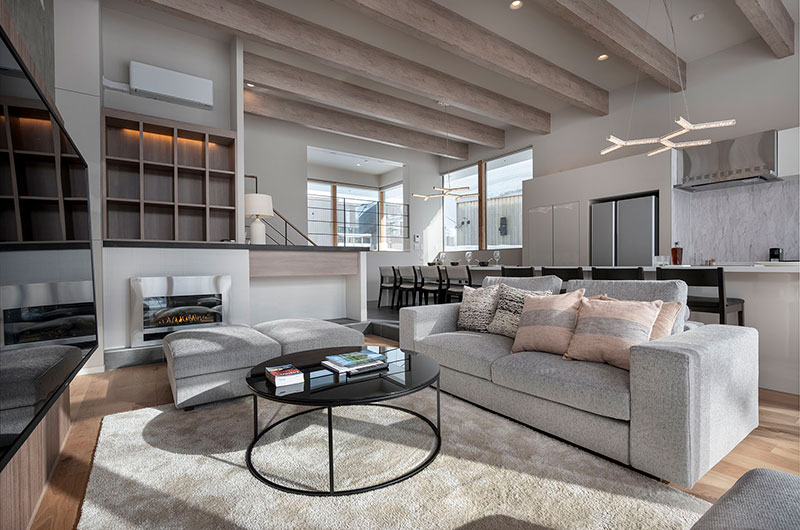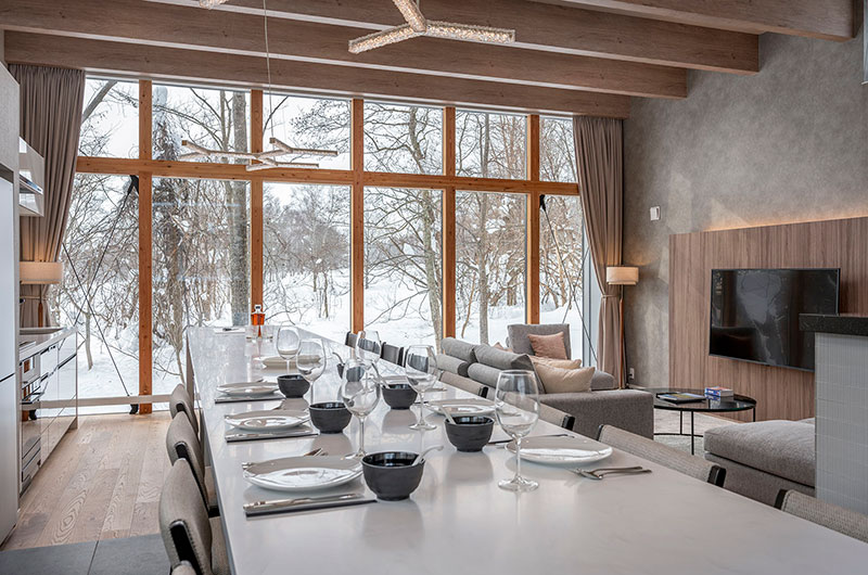The living room sits on the chalet’s upper floor, offering picturesque views of the snow-covered forest through floor to ceiling windows. You can enjoy the views and the warm glow of the fireplace while relaxing on the grey sofa or opt for the lounge chairs instead. You can also catch up on the latest movies thanks to the well-sized smart TV that’s mounted on the wall.