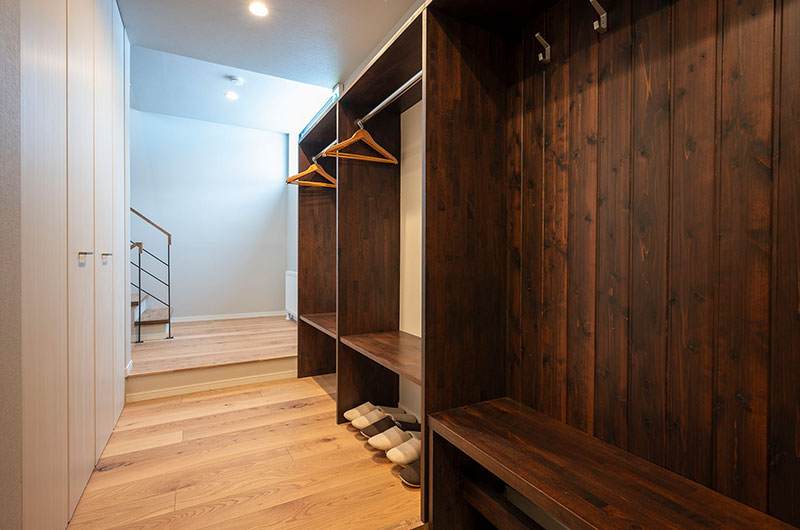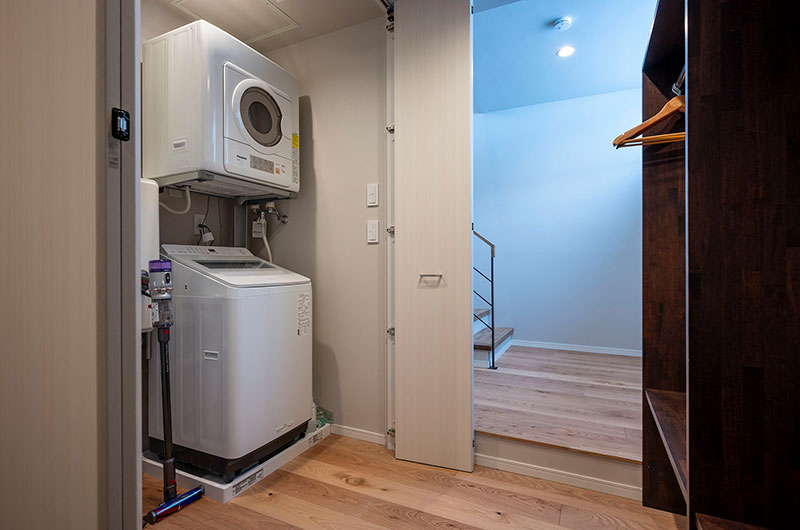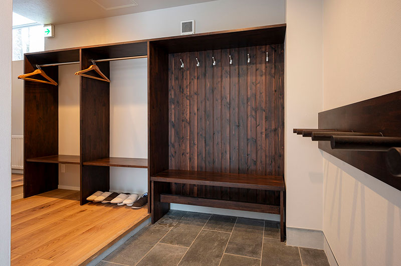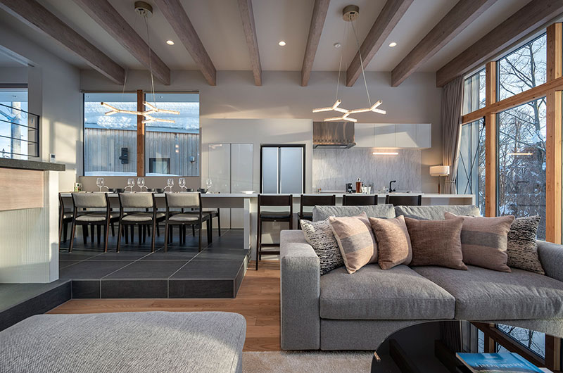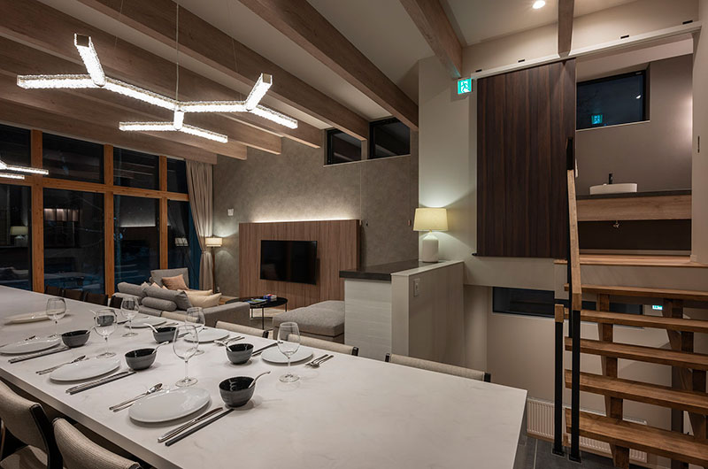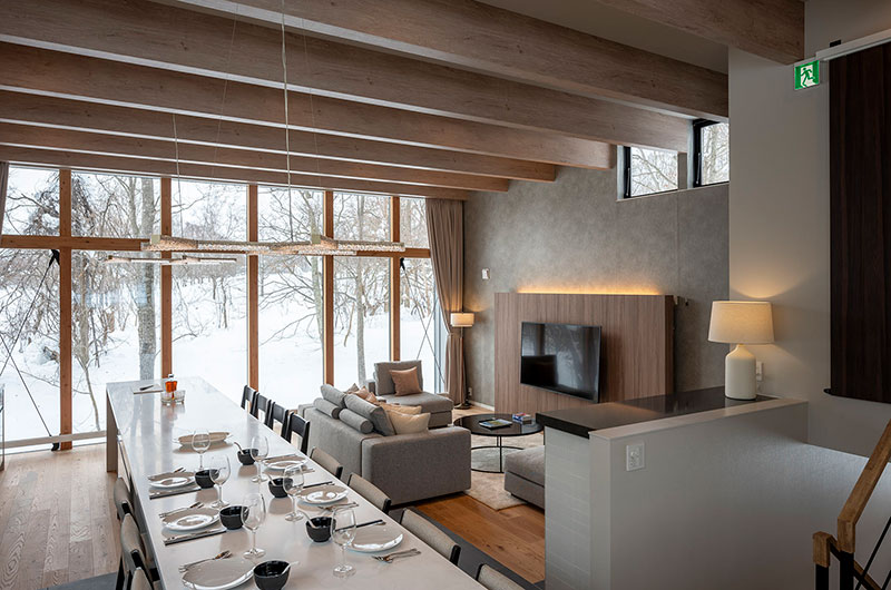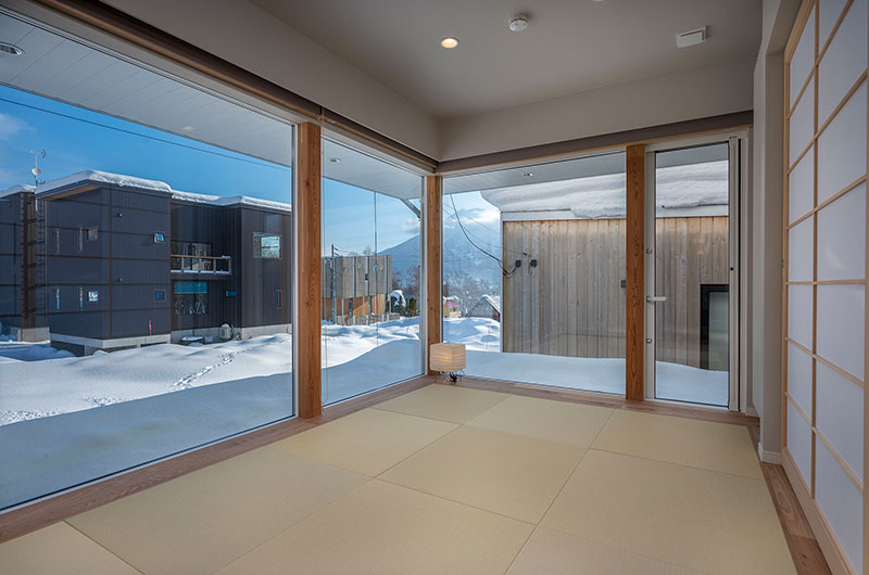 Kumirin is a three-bedroom chalet. From the entrance, one staircase leads down to the lower ground floor which houses two bedrooms. Another set of stairs leads up to the living and dining room. From here, a small set of stairs leads up to the tatami bedroom housed on the chalet’s top floor.