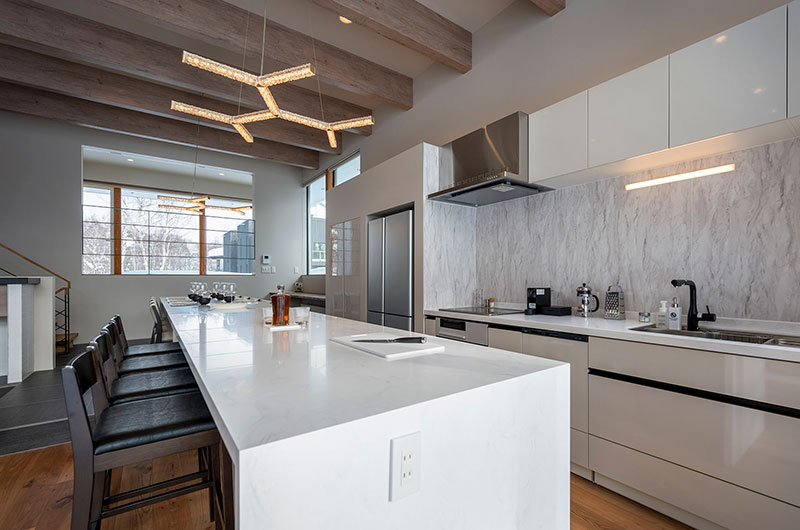 The dining area has a great layout. The sleek white island which offers oodles of counter space when preparing meals extends to the chalet’s dining table. This means you have a huge stretch of space both for cooking and enjoying meals. The table can easily seat a group of 12. The kitchen offers all the necessities and then some – the Nespresso machine is a welcome addition for anyone heading out to the slopes bright and early.