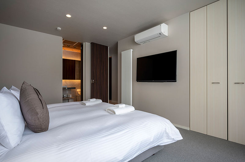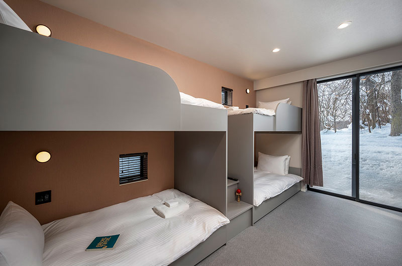 This room is located right across the hall from the first bedroom. It features two sets of bunk beds, a flatscreen TV, full wall windows, and wardrobes. There is no ensuite bathroom, but there is a standalone bathroom with a Japanese bath and a shower right next door, and a separate powder room across the hall.