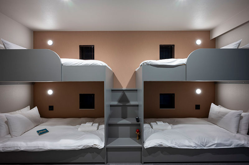 Kumirin features three bedrooms. The bedrooms are very versatile: one of them features a king bed (or two singles if you prefer) and one has two sets of bunks. These two rooms are located downstairs. The third room, which is housed upstairs, is a traditional tatami style room where two guests can sleep on futon mattresses.