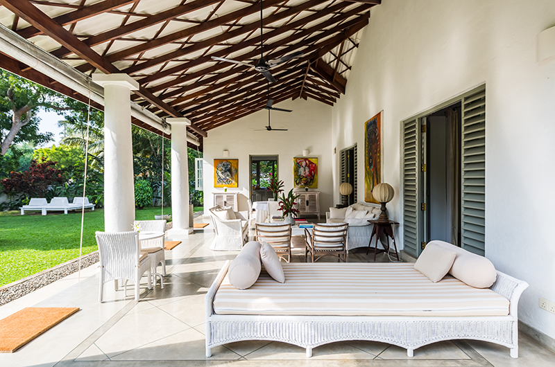 The shaded veranda works as a breezy alfresco living room with views overlooking the lawns. Take your pick between the light toned sofas and armchairs and enjoy swapping stories with your companions.