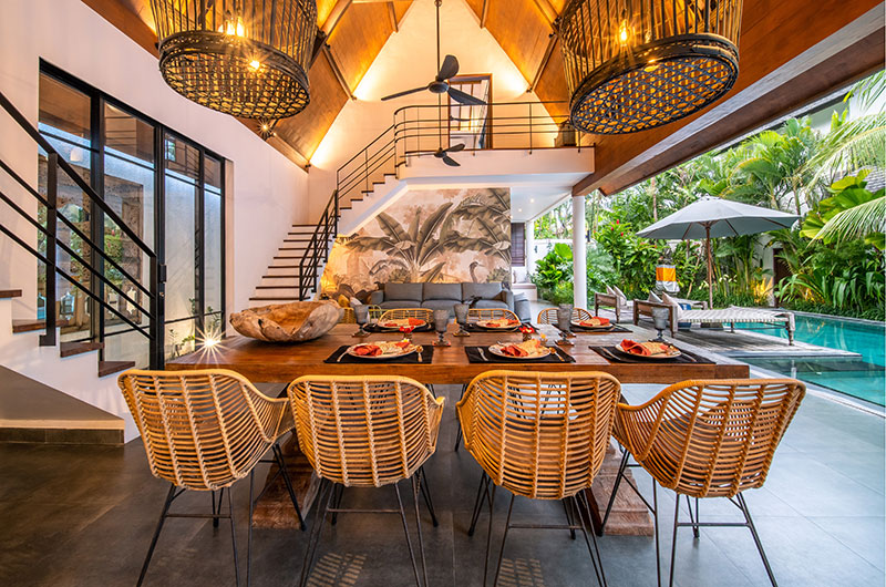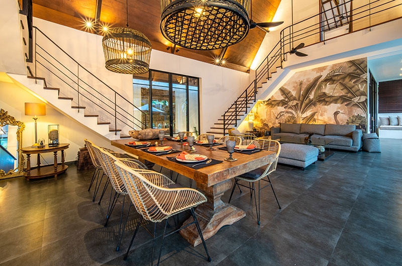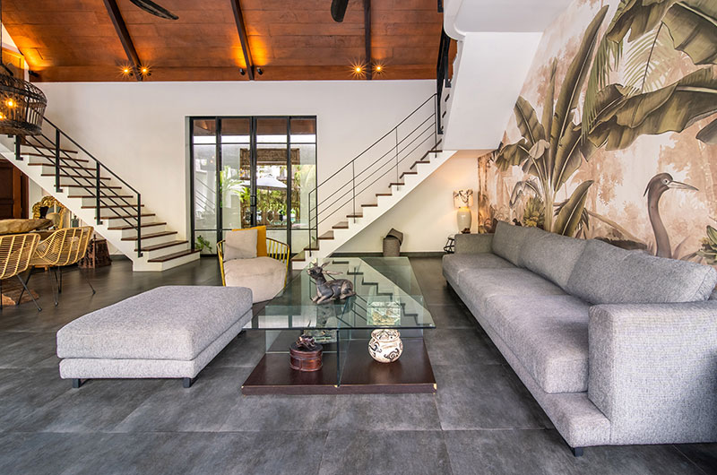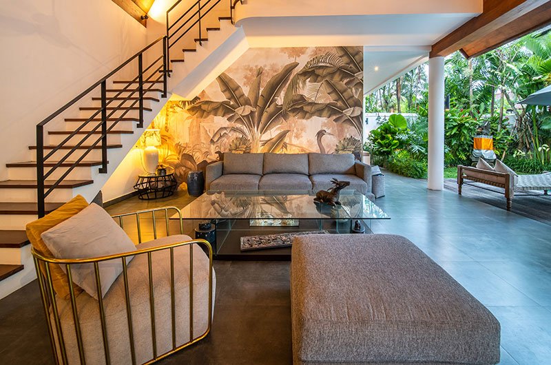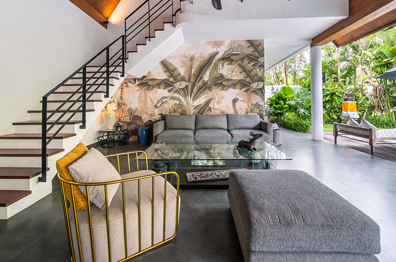 In each of the villas, the living room is a wonderful airy space that takes up most of the ground floor. Crowned with a sky-high cathedral ceiling and connecting fluidly to the poolside terrace, this is the villa’s social hub – a relaxing place where you can get together and enjoy the villa and each other’s company to the fullest. There’s a dove grey sofa and matching chairs to relax on, with one statement wall depicting a jungle scene adding to the room’s tropical appeal.