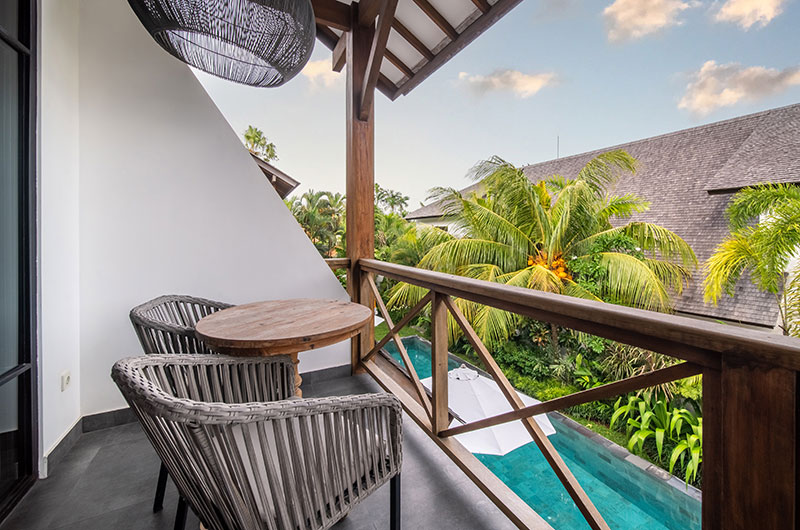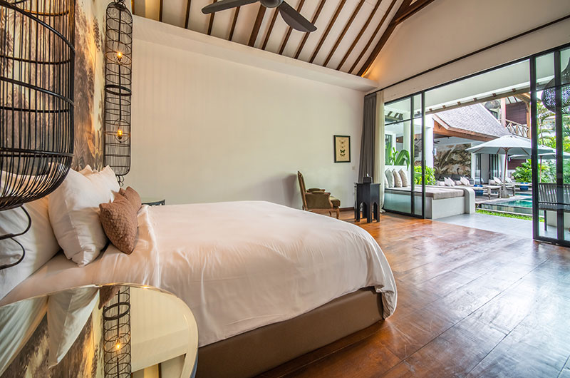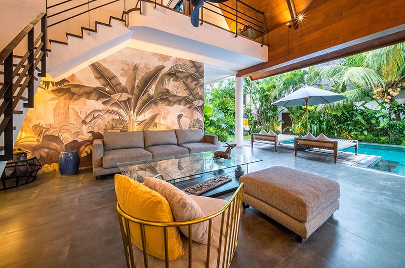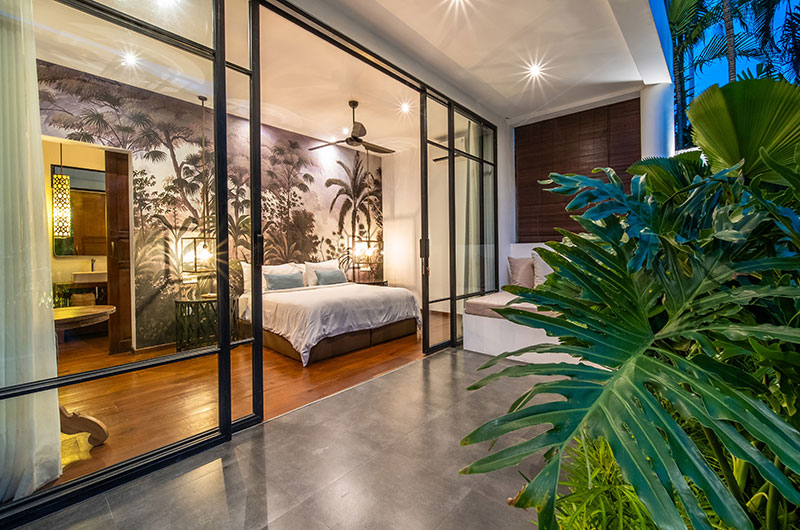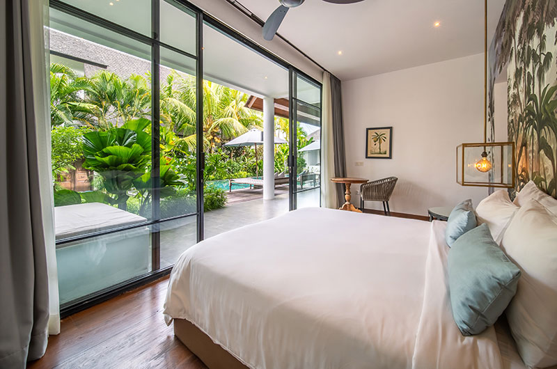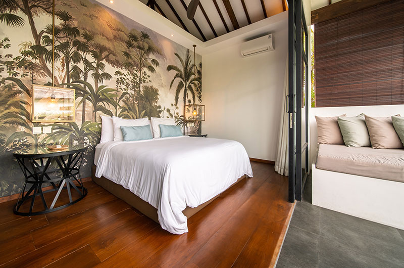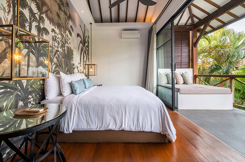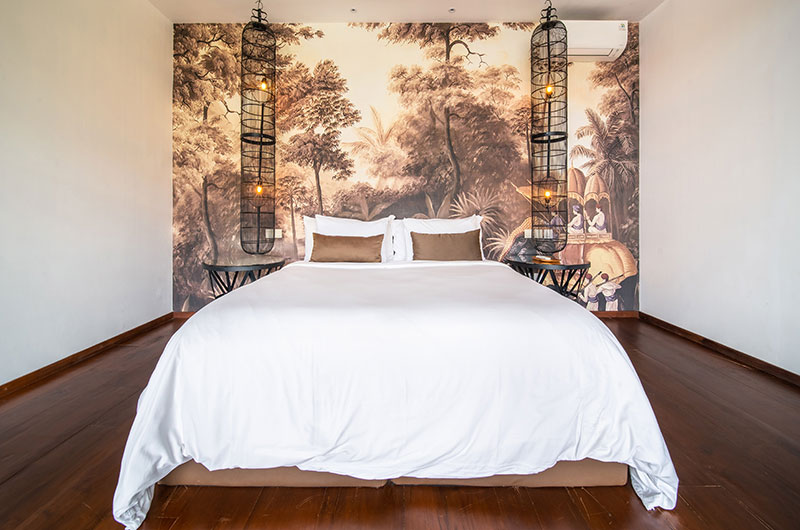 Each of the villas features four bedrooms. The bedrooms are decorated in modern tropical style with large jungle murals framing king-sized beds. Each room features an ensuite bathroom and offers access to a private balcony or directly to the poolside terrace. There are two bedrooms on the ground floor and two rooms are housed upstairs.