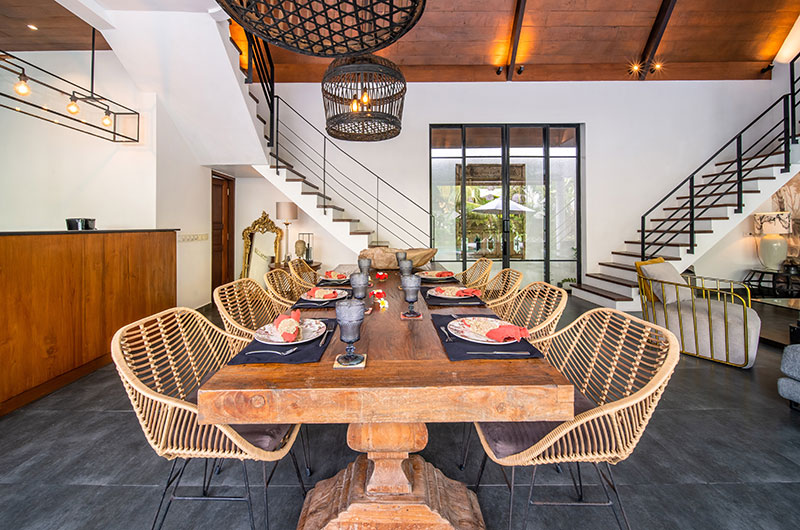 The dining area is a fluid extension of the lounge, with the whole space seamlessly connecting to the pool and garden. This means you can keep the conversation going between people relaxing on the sofas, those enjoying the pool, and the members of your group still lingering around the dining table. And speaking of the dining table – this is a beautiful timber number which can easily seat a group of eight on modern wicker dining chairs, with large statement lanterns illuminating the space after dark. The dining areas extends to an open-plan kitchen fitted with all the gadgets and cutlery you might need, including a Nespresso machine for the coffee lovers.