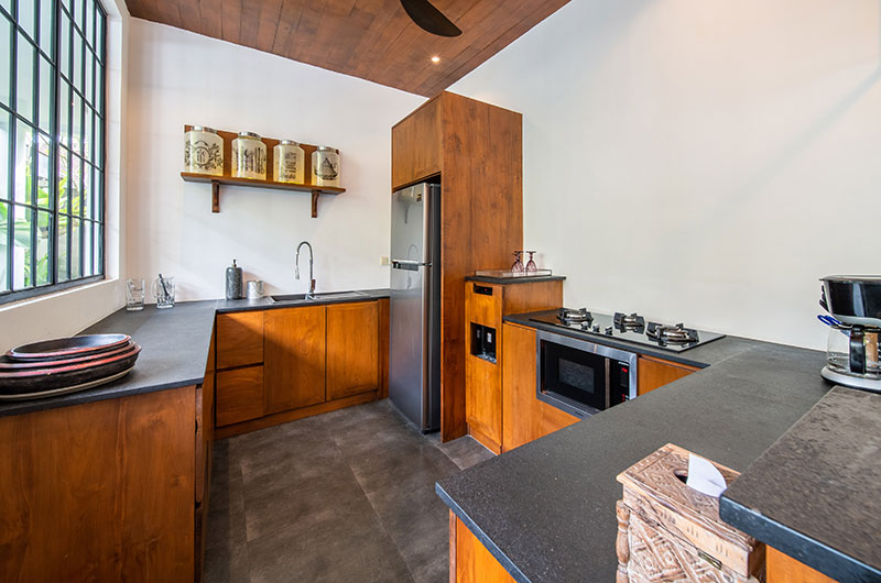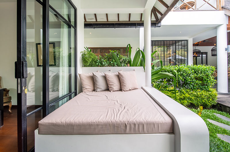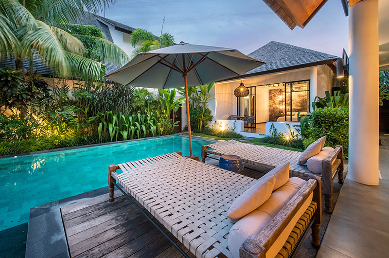 Thanks to the villa’s open-plan design, the lines between indoor and outdoor living become deliciously blurred – a hallmark of lush tropical living. The living areas are fluidly connected to the villa’s beautiful blue swimming pool, which is in turn framed by luscious tropical plants. A traditional Balinese shrine adds another beautiful element to this lush tableau. The pool features a shallow section where you can chill out with a drink in hand, with two sets of stairs providing ease of access. The pool is surrounded by four well-sized sunbeds and two ample parasols that ensure you always have a choice between sun and shade.