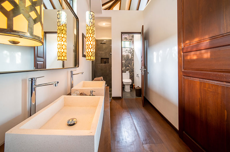 The second bedroom is located opposite the first bedroom. This room is also accessed through its own private staircase. This jungle themed room also features a king-sized bed and connects to a private balcony. The adjoining bathroom features a shower, dual sinks and a separate toilet cubicle.