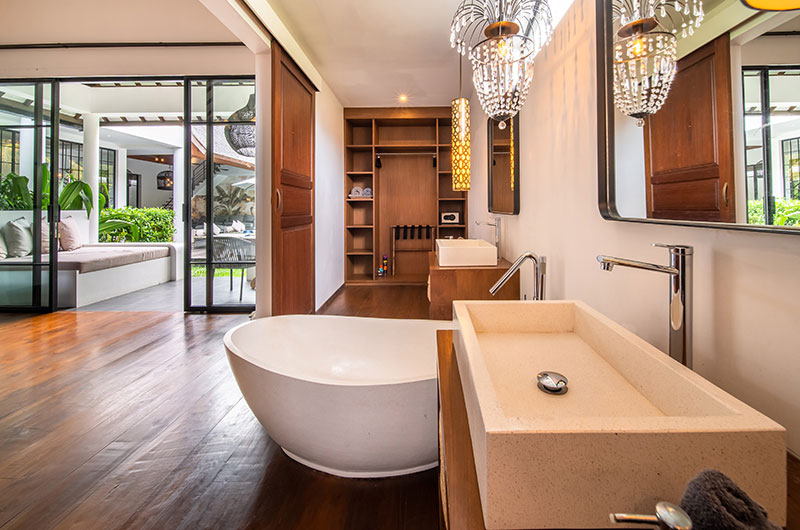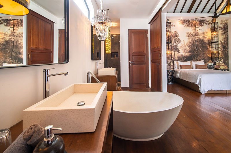 The fourth bedroom is housed in its own pavilion by the pool and provides an added sense of privacy. The room features a king-sized bed and opens to a private terrace fitted with a daybed and a small table with chairs. The pool is just a few easy steps away. The ensuite bathroom is gorgeous and features a bathtub, chandelier, shower enclosure, dual sinks and a separate toilet.