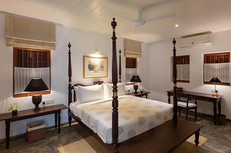 Leela Walauwwa has four bedrooms, all furnished with a king-sized bed and adjoined by an ensuite bathroom. All rooms feature flatscreen TVs. One bedroom also includes a daybed which can sleep one extra guest. There are three bedrooms on the ground level surrounding the living areas. The fourth bedroom is located upstairs.