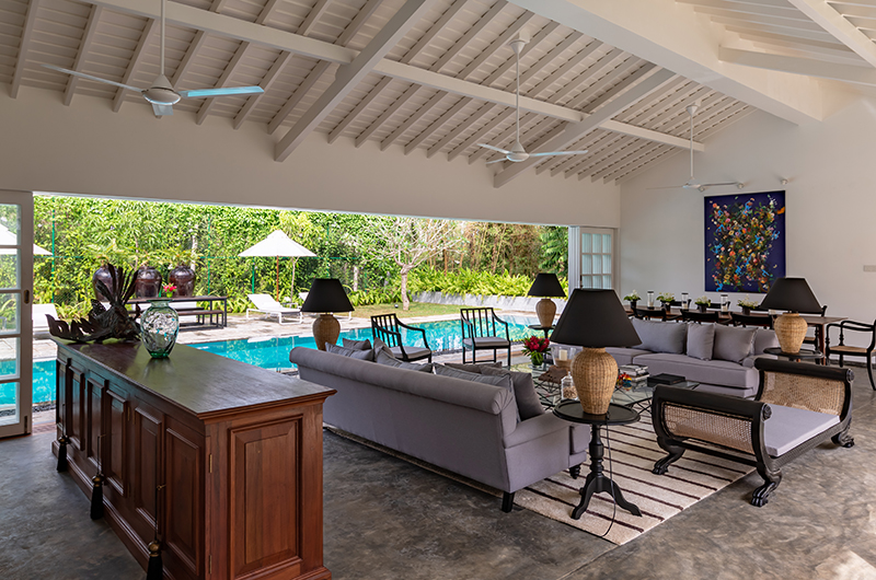 The villa is surrounded by leafy green gardens and towering palm trees, with a sumptuous 18-metre pool taking pride of place. The sun kissed deck surrounding the pools offers a prime spot for relaxing on one of the white loungers provided. The grounds also include a beautiful shaded pavilion that’s ideal for quiet contemplation with two daybeds surrounded by lush greenery.