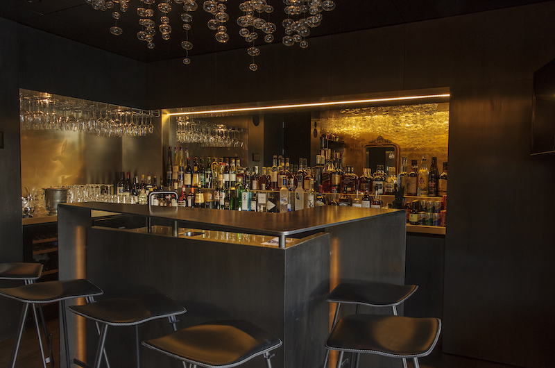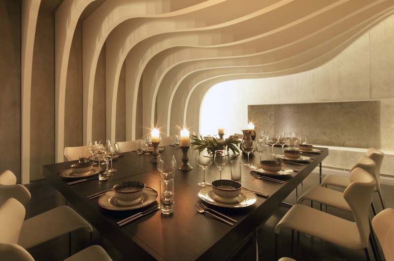 The villa’s underground dining room is a dreamy space with a uniquely curved white ceiling mimicking the soft waves of the ocean. This intimate space centres around a dark wood dining table surrounded by 12 white chairs. You can also dine up on ground level, where a long black dining table offers seating on 12 matching chairs. Of course, the villa comes with a fully equipped gourmet kitchen as well as a wine cellar and a bar to help to keep the good times rolling.