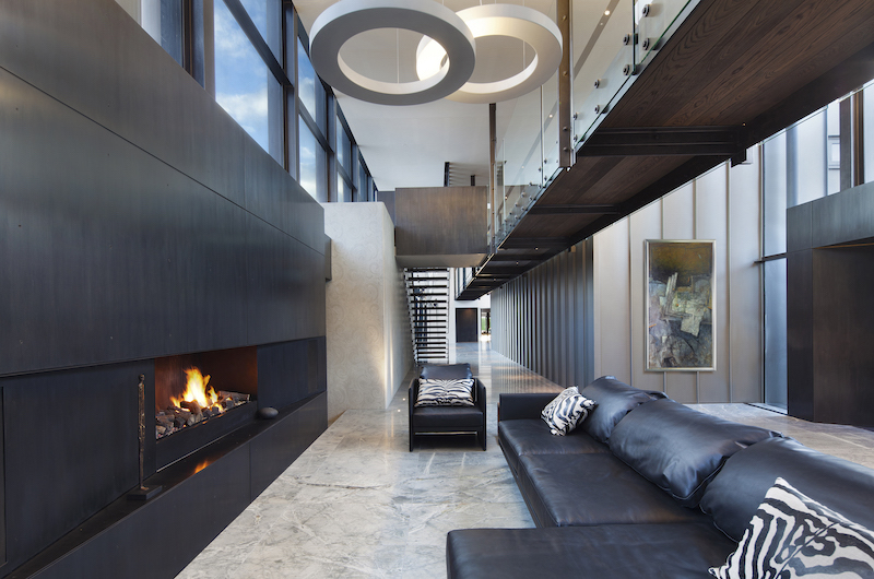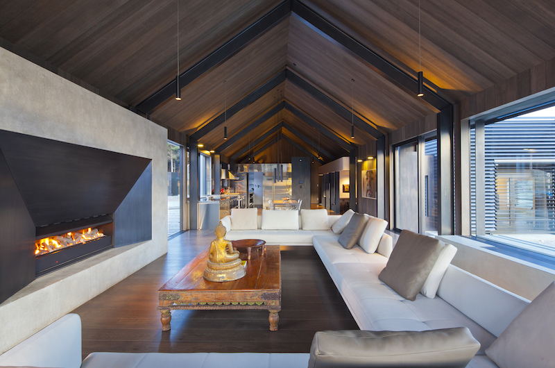 True to the villa’s sprawling layout, the property includes multiple living areas to choose from. The main living room is a fluid space surrounded by full-wall glass, with a high peaked ceiling only adding to the sense of space and light. The room is furnished with a large white sofa, a tranquil statue of the Buddha and a gorgeous designer fireplace. A second lounge area is a sleek and seductive space with plush leather seating and a dramatic black fireplace to match.