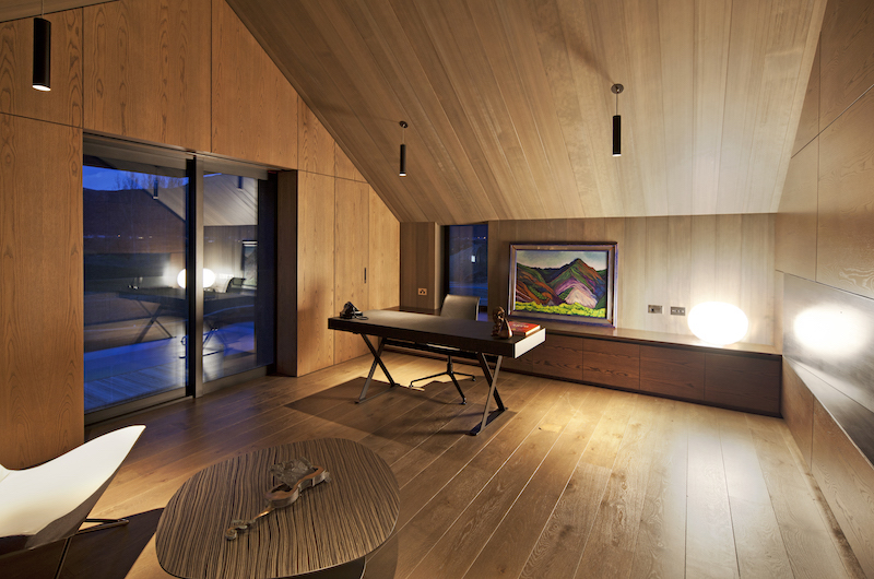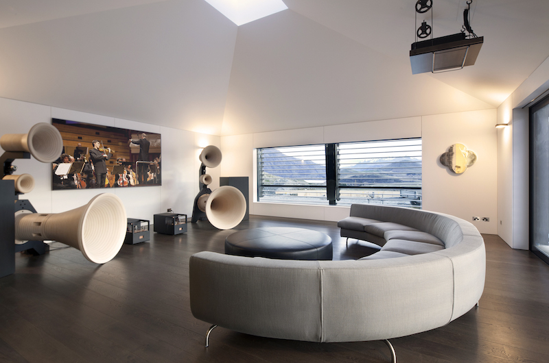 The state of the art media room is like something out of a futuristic sci-fi movie. The room centres around a curved white sofa facing a large wall-mounted screen flanked by massive retro fabulous speakers. Definitely a place for entertaining the whole family in style!