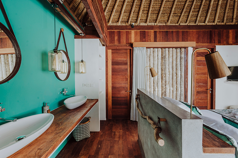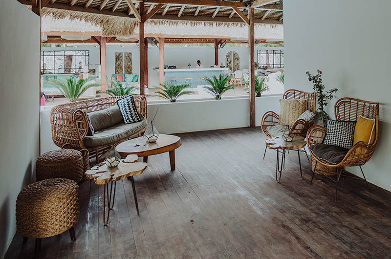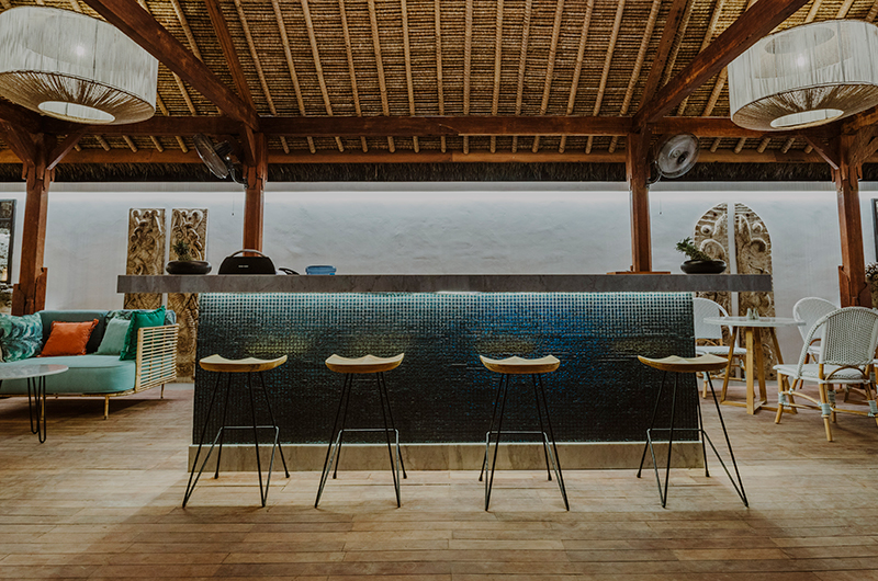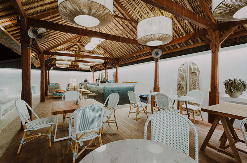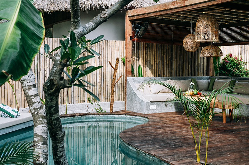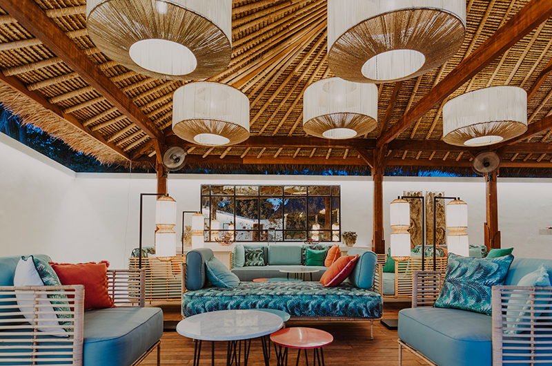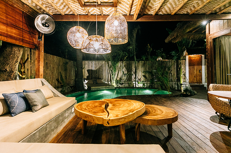 Each villa has its own open-sided living room which connects to the poolside deck fluidly. The room features an in-built sofa lit up by beautifully woven lanterns.