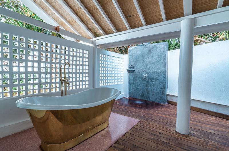 The fourth bedroom is located in the same building as bedroom 3 and looks out to the ocean, with glass doors opening to the poolside deck. The blue-themed room has a king-sized bed and the ensuite bathroom is fitted with a gorgeous free-standing bathtub and an outdoor shower.