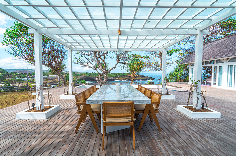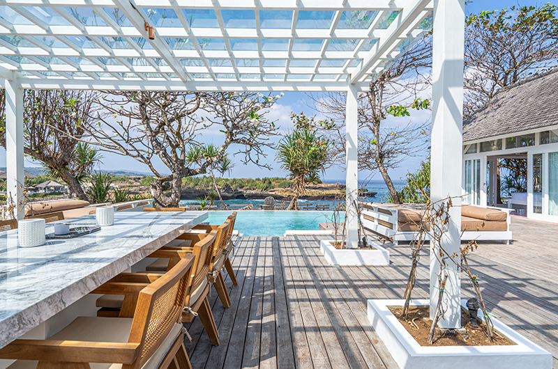 Dining at the villa is an alfresco affair, with a beautiful marble top table housed in an open-plan pavilion by the pool. Guests enjoy beautiful views of the ocean bay while dining. The table can seat 10 guests, with the villa’s kitchen located close by in the main building.