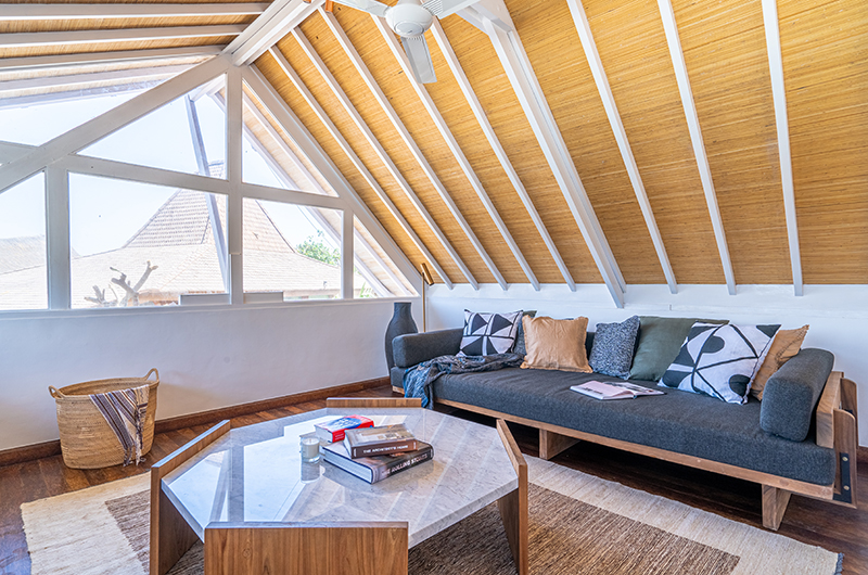 The living room is a breezy open-sided space which connects seamlessly to the outdoor deck and also incorporates the villa’s kitchen. The double-height space is furnished with an elegant U-shaped lounge, with an oriental carpet thrown on the floor adding a touch of the exotic, contrasted by evocative modern art adorning the walls. There is a second, fan-cooled TV lounge on the villa’s upper floor.