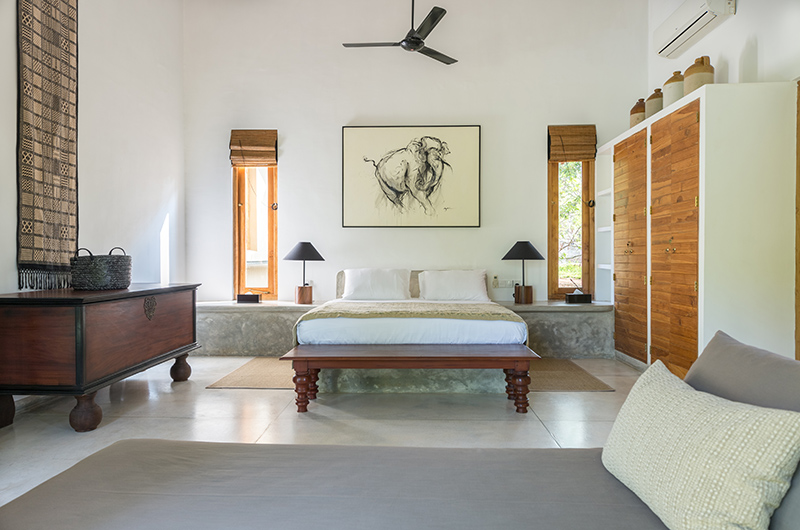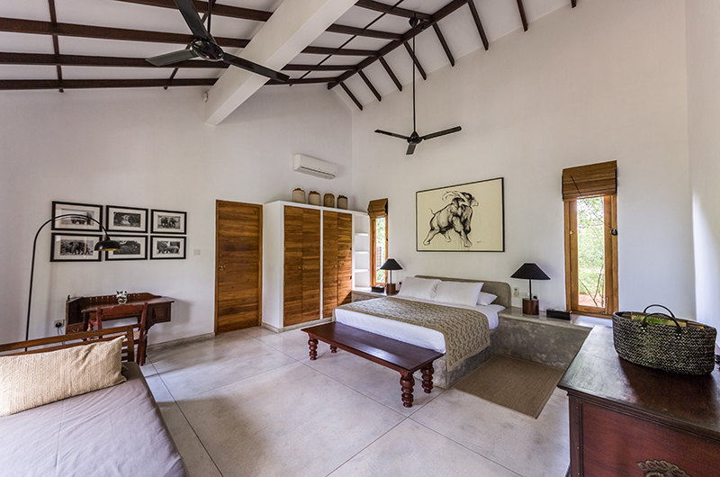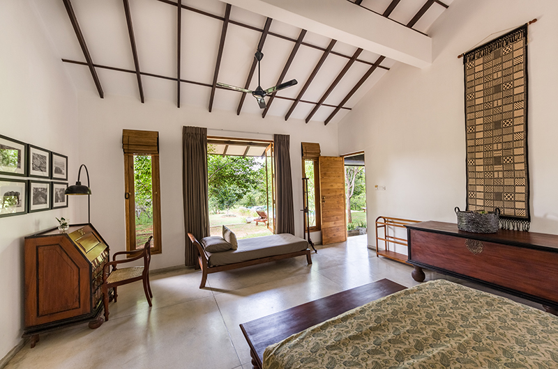 Mayur Lodge has two bedrooms, both furnished with a king-sized bed and adjoined by an ensuite bathroom. The bedrooms are decorated in natural tones with classic furniture, creating a harmonious feel with the surrounding nature.