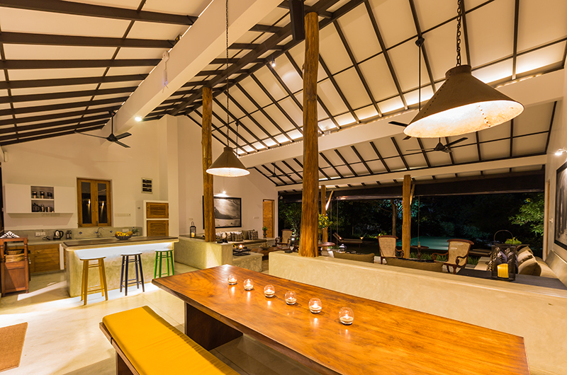 The dining area is located a step above the living room lounge, with ceiling fans helping to keep the space nice and cool. The wooden table is lined with two benches, with a fully-equipped kitchen adjoining the dining area seamlessly.