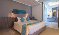 The living rooms are located on the same level as the private swimming pool in each standalone villa. Decorated with light tones and streamlined furniture, the living room is lined by glass doors which can be closed off when you need a break from the elements. The villas also have separate TV rooms, with in-villa entertainment provided by a widescreen TV with satellite channels and movies on-demand. The villas are also fitted with Bluetooth speakers.