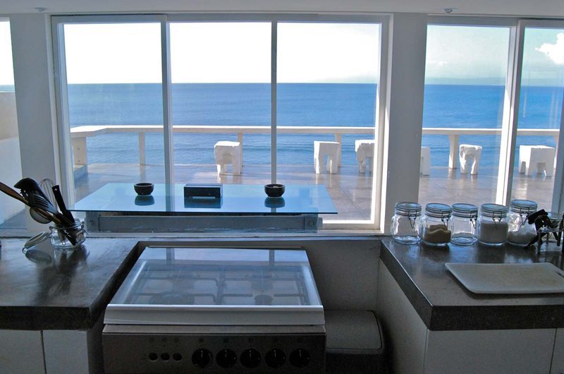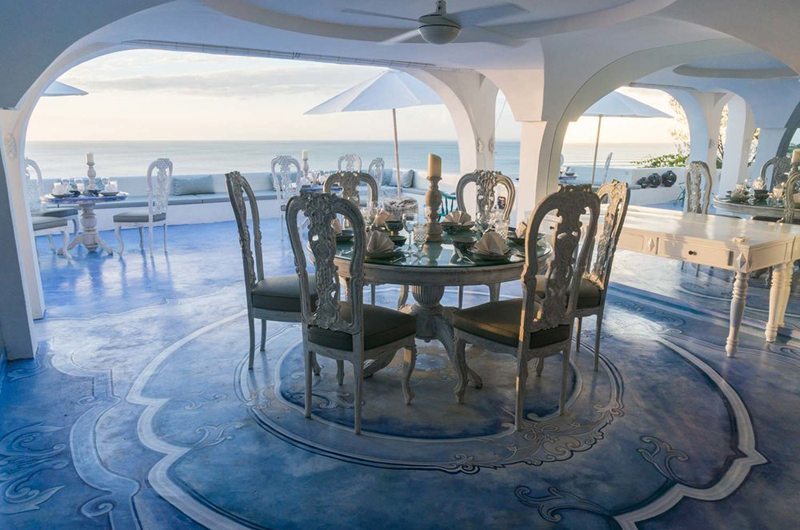 The villa offers options for dining both indoors and out on the balconies with views overlooking the ocean. The villa also offers two kitchens and a basic kitchenette.