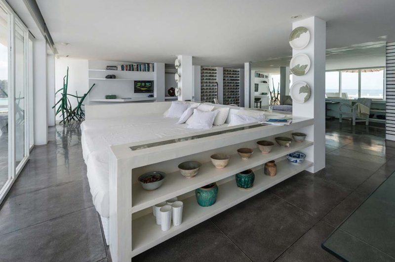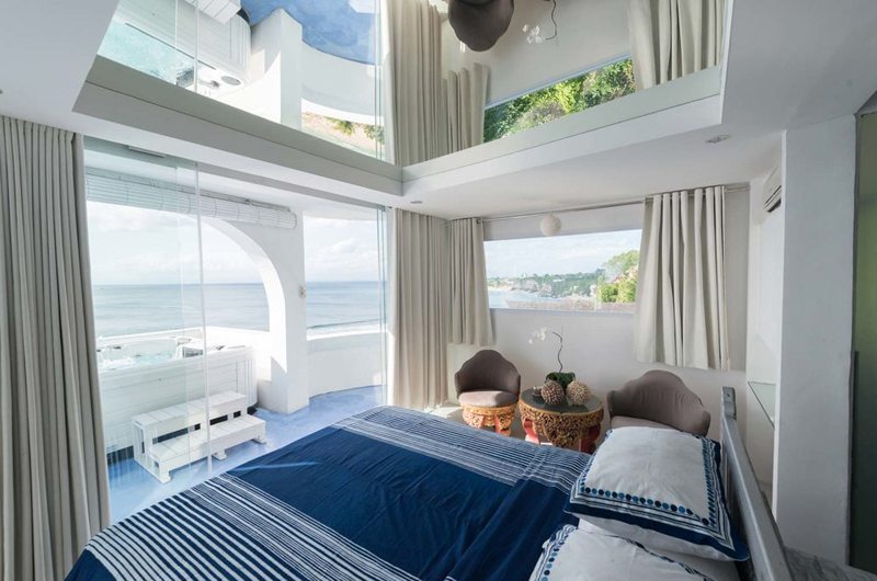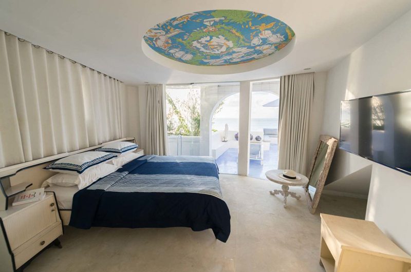 This master bedroom is lined by a full-length window offering sweeping ocean views. The gorgeous white suite has a double bed and TV with international channels. The room was designed by Pascal Morabito from start to finish.