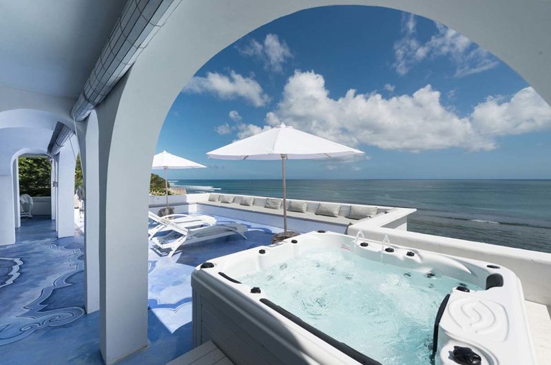 The villa offers two lush terraces where you can relish the tropics. The Bali Temple Terrace features an ornately carved Balinese doorway and provides a picture-perfect setting for dining under the stars. The relaxed Living Terrace houses a plush sofa and sun-beds flanked by a luxurious jacuzzi tub, where you can indulge in a relaxing soak while gazing out into the ocean.