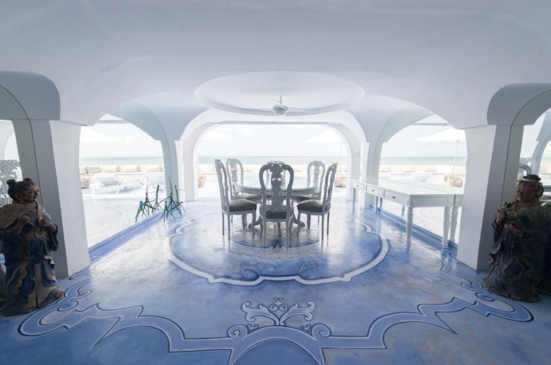 Santorini Penthouse has a palatial living area with majestic mandalas etched across the floors and curved white ceilings providing delicious refuge from the midday sun.