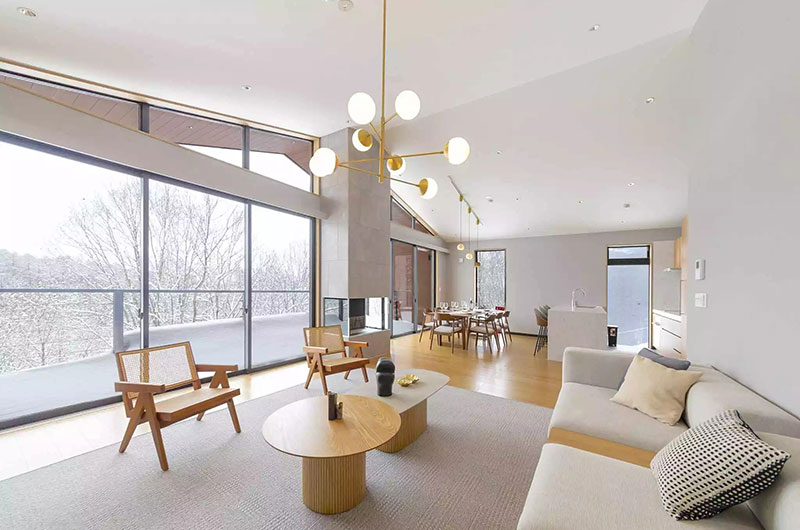 With two living rooms, Mori Casa allows guests to hang out as a large troupe and splinter off into smaller groups when needed. The main living area sits on the upper floor and features full wall windows looking out to the surrounding forest. You can also enjoy those views out on the adjoining balcony. Flooded with natural light, the room features ample sofas and armchairs with a large TV to keep everyone entertained. A fireplace positioned at the centre of the room adds a warm glow on cold winter nights. Downstairs, there is another living room with a similar setup, complete with generous sofas, a huge TV, and full wall windows looking out to the snow.