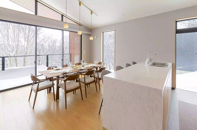Mori Casa is a graceful modern chalet nestled amid tranquil Hokkaido forest. Surrounded by serene nature yet just a short drive from the nearest ski lifts, this location really offers the best of both worlds. The chalet is packed with plush modern comforts, including two Japanese baths, a fireplace, two kitchens, ample lounges and more. With its calm décor and storybook surroundings, Mori Casa will leave your whole group feeling merry and bright.