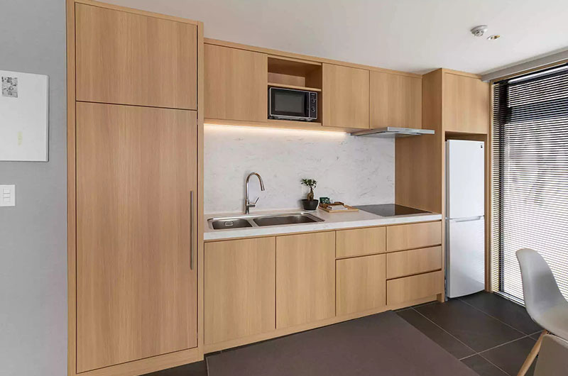 This room is located next to the second bedroom. The room features either a king-sized bed or two singles – whichever suits you best. There’s also a work desk, wardrobes, and huge windows looking out to the forest. The ensuite bathroom is fitted with a shower, vanity, and a toilet.