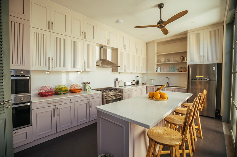 The dining area is incorporated to the living room and offers the same blissful views of the pool and beach through glass doors. The dark wood dining table can easily seat a group of 10, though if you prefer, you can also dine outside in the poolside pergola. The villa’s kitchen is discretely tucked away from the dining area, allowing guests to dine in private while the staff prepares the next course in the kitchen.