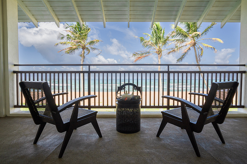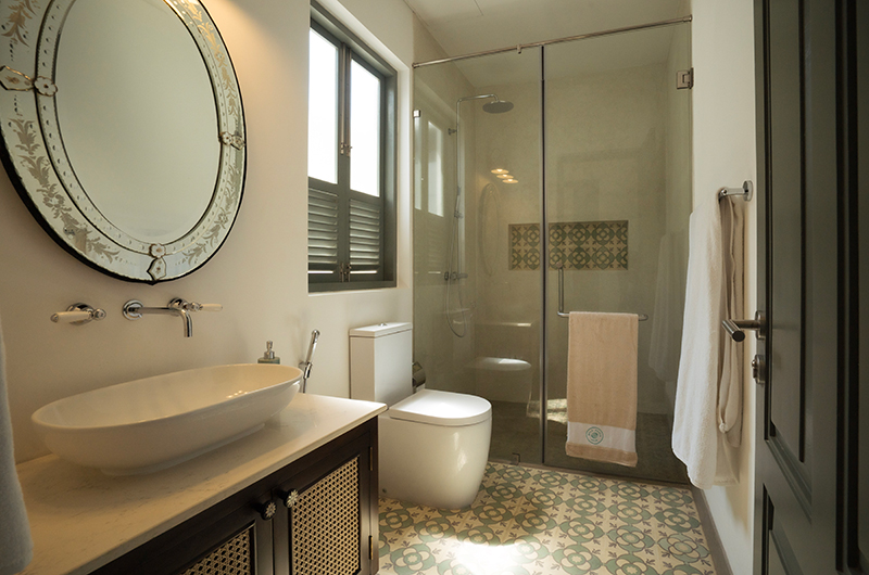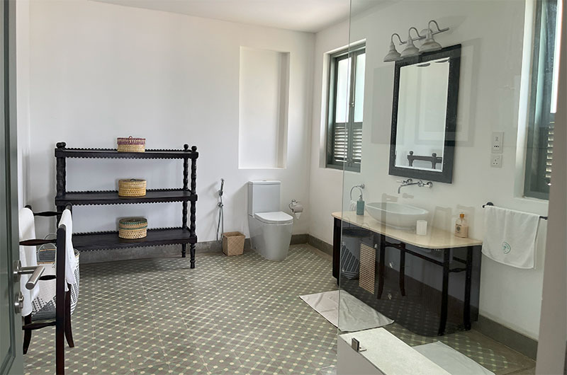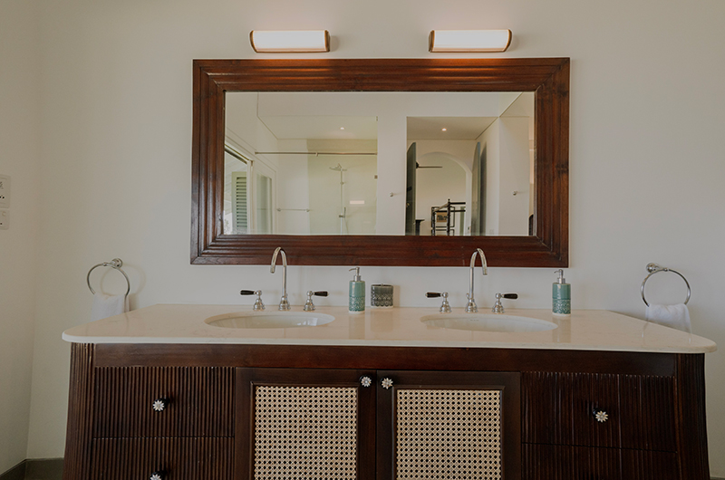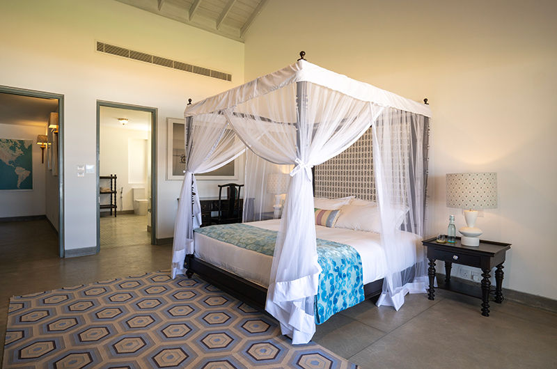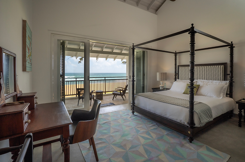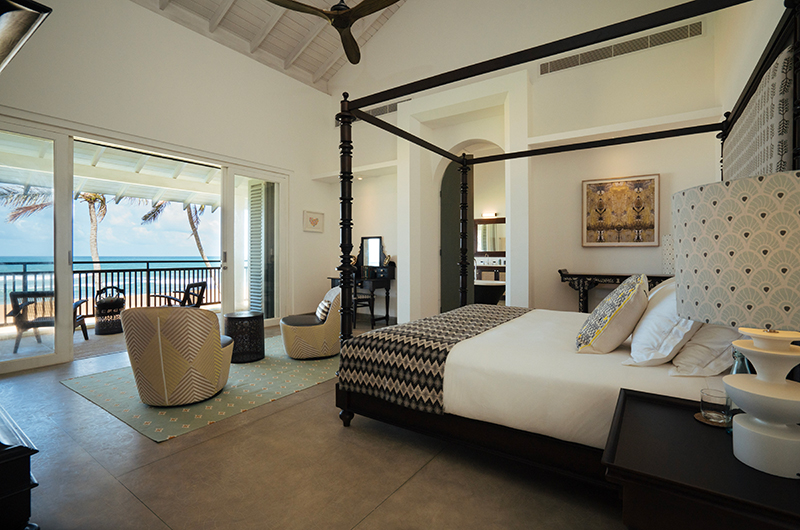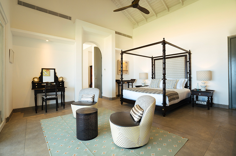 Myla Beach Villa features four bedrooms. The bedrooms are all located on the upper floor and they each connect to an ocean view balcony. The bedrooms are beautifully decorated, mixing a fresh modern palette with antique pieces and teakwood furniture. Each room features a four-poster bed and an adjoining bathroom.