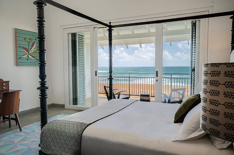 Myla Beach Villa puts a beautiful Sri Lankan twist on beach house glam. It’s hard to imagine a more appealing setting, with the villa’s private pool and neatly manicured lawns seamlessly blending with the soft sandy beach waiting on your doorstep. Inside its white walls, the villa effortlessly mixes fresh modern interiors with natural materials, vibrant prints and gorgeous antiques. That the owner is a celebrated interior designer is evident in every room and detail, from the tiled floors to the vintage posters which adorn the walls.