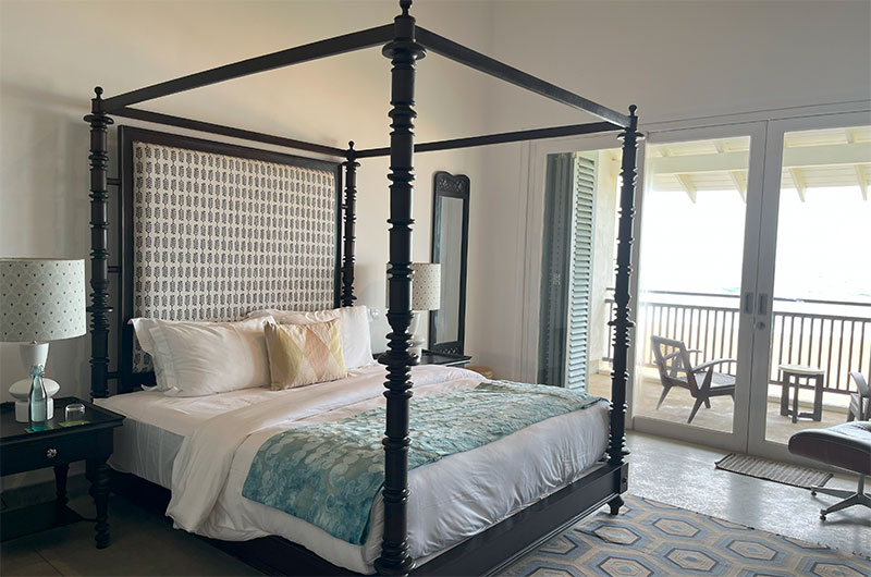 This bedroom features a four-poster bed, a writing desk and closets. The adjoining balcony offers beautiful views of the ocean. The ensuite bathroom is nice and spacious and features a shower, vanity and toilet.