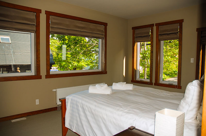 The first bedroom is one of two rooms located on the middle floor. This room has a split bed (king or two singles) and there is a bathroom right outside in the hallway.